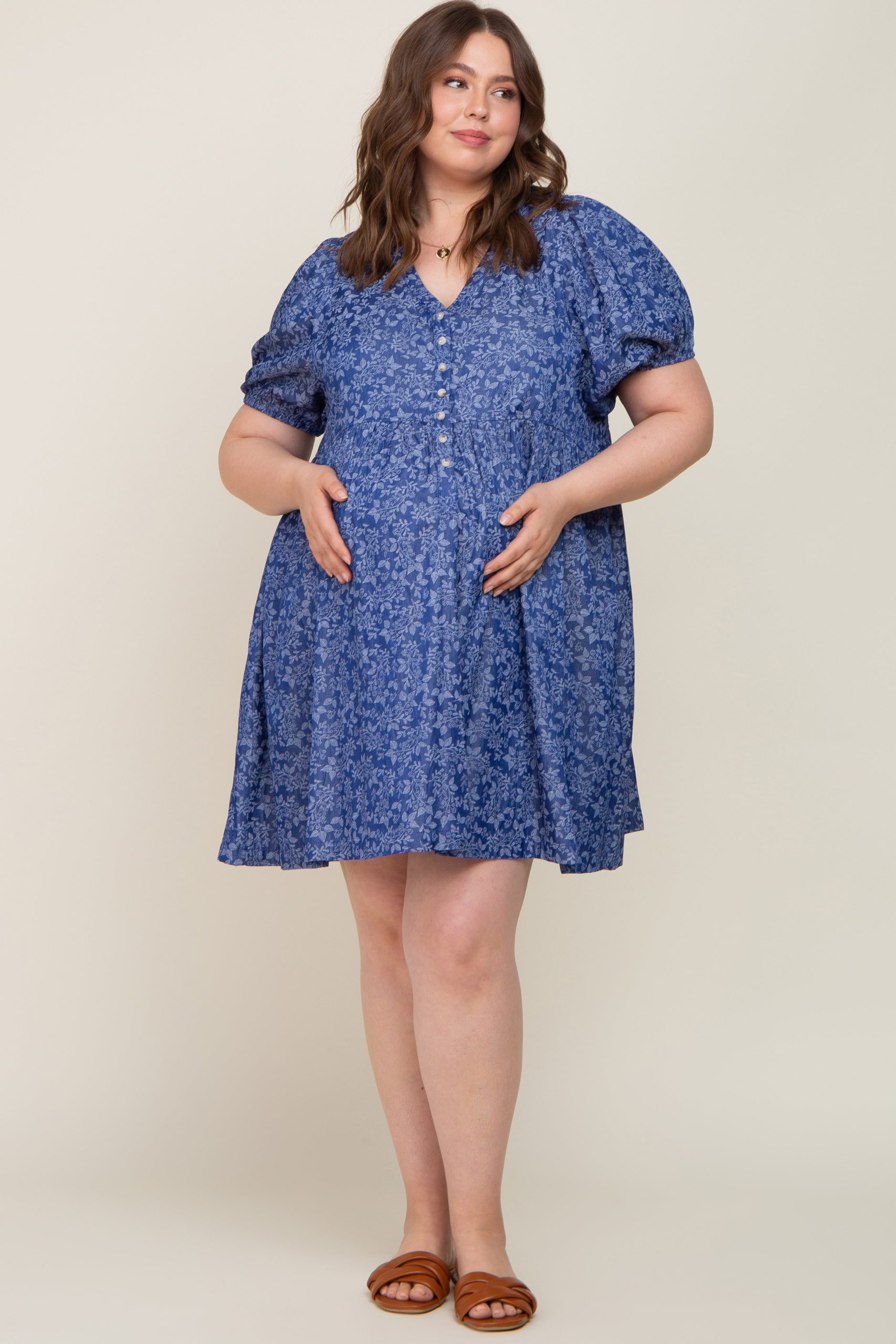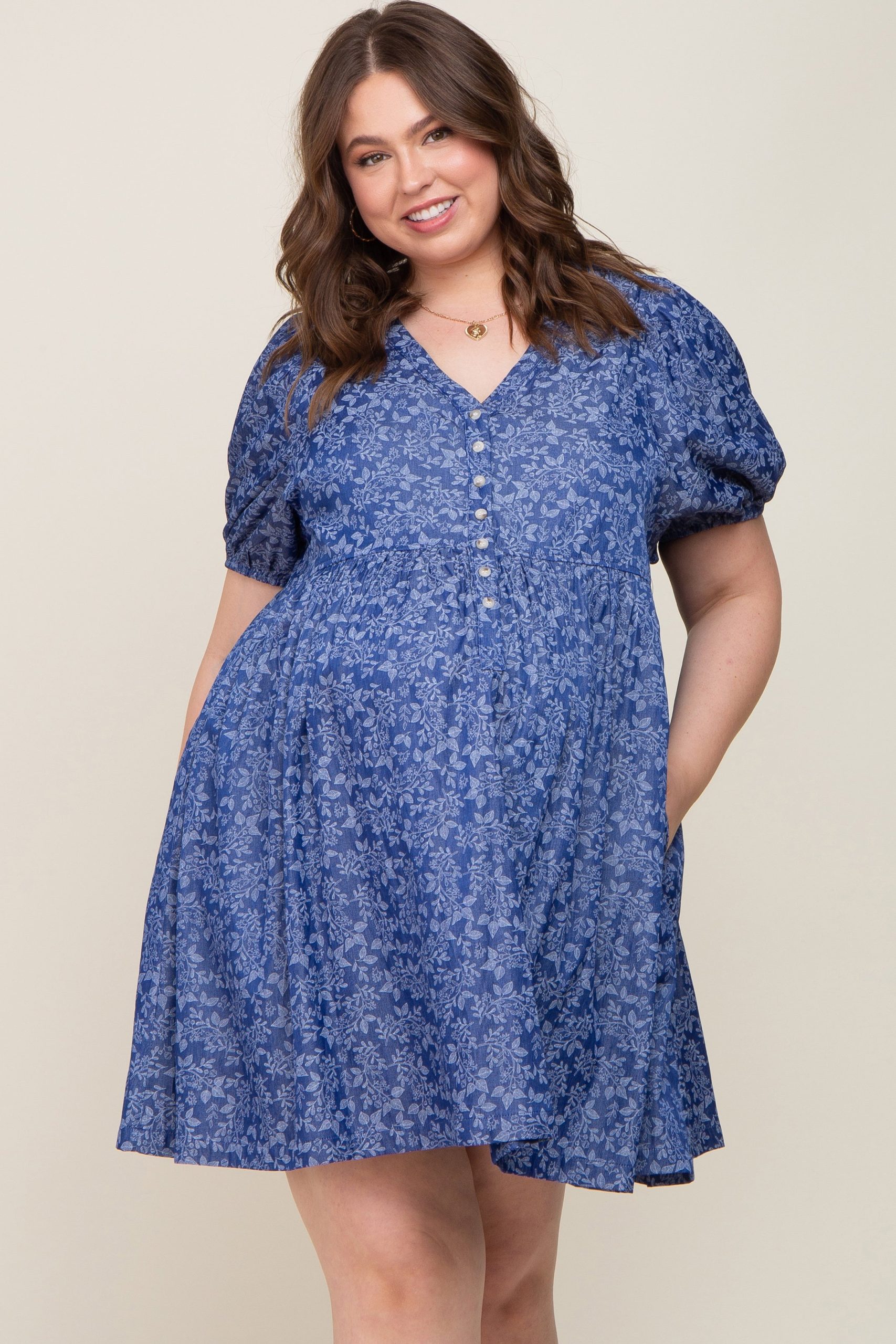 Details A floral print maternity plus size dress featuring a v-neckline, short puff sleeves, front buttons, an empire waist and side pockets. Content + Care