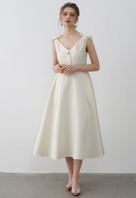 Shine brighter in the Bow Shoulder Zircon Button Midi Dress with its timeless charm and modern elegance. This dress features a flattering V-neckline and a flowy silhouette that moves gracefully with you. The bows on the shoulders add a whimsical touch, while the zircon button embellishments provide a sparkling finish. Practical side pockets and padded cups ensure both comfort and style.