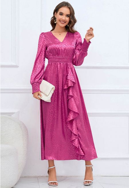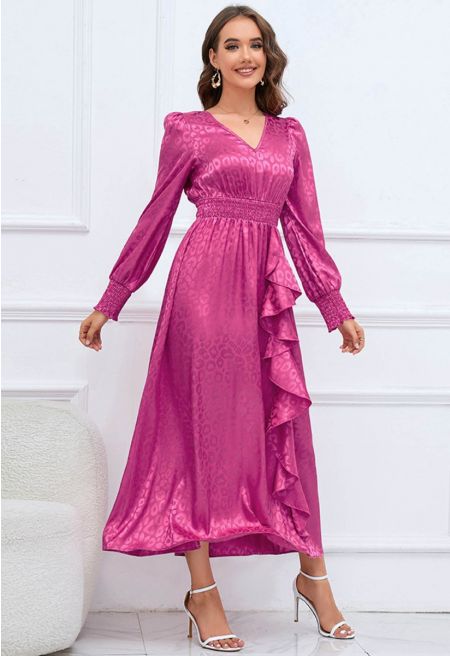 Glossy Leopard Jacquard Ruffle Maxi Dress in Magenta