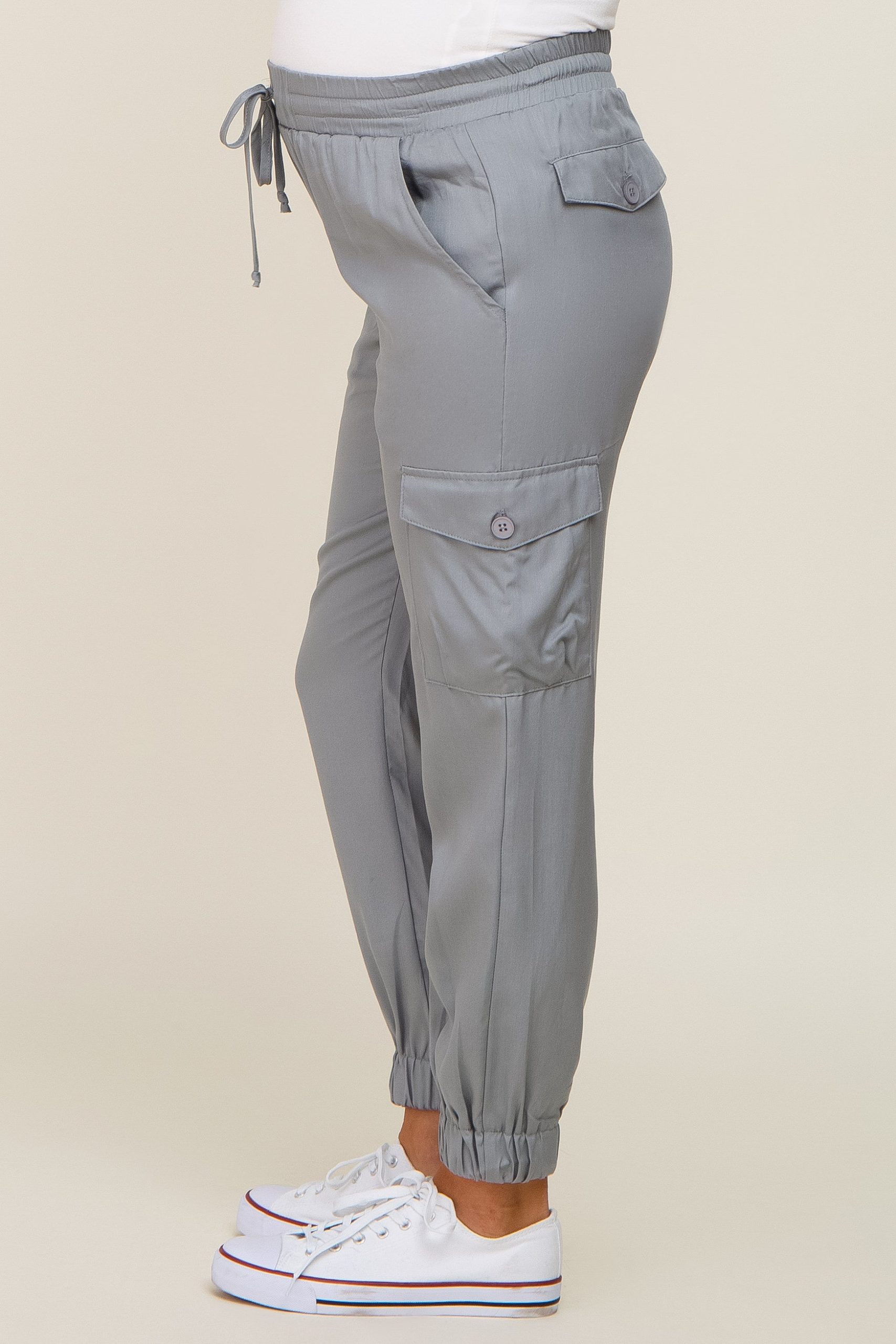 Details A pair of maternity cargo pants featuring an adjustable drawstring, an elastic waistband side pockets and four buttoned pockets. Content + Care