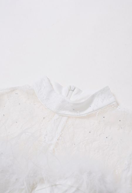Meticulously spliced lace meets playful feather trim, creating a symphony of textures that dance with every step. The bodycon fit sculpts your figure, while the midi length adds an elegant air. Ideal for those who love to blend sophistication with a touch of whimsy.