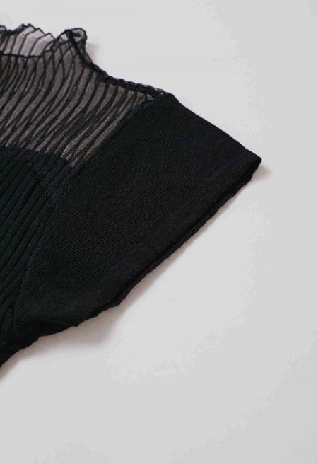 Elevating everyday style through spliced structure, this top captures modern sophistication. The ribbed knit body offers a snug, flattering fit, while sheer mesh panels add edge and intrigue. An asymmetric cut enhances the contemporary vibe. Perfect for both casual and upscale looks, it redefines minimalist chic.