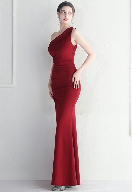 One-Shoulder Ruched Waist Split Gown in Burgundy