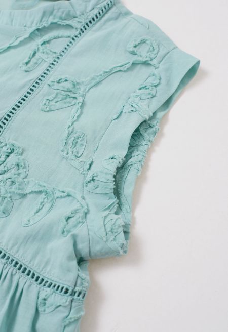 Discover the art of chic with our sleeveless top, beautifully adorned with 3D floral accents featuring raw fringe. The eyelet trimming enhances its elegance, while buttons at one shoulder add a practical touch. This top is an impeccable choice for adding a sophisticated flourish to any ensemble.