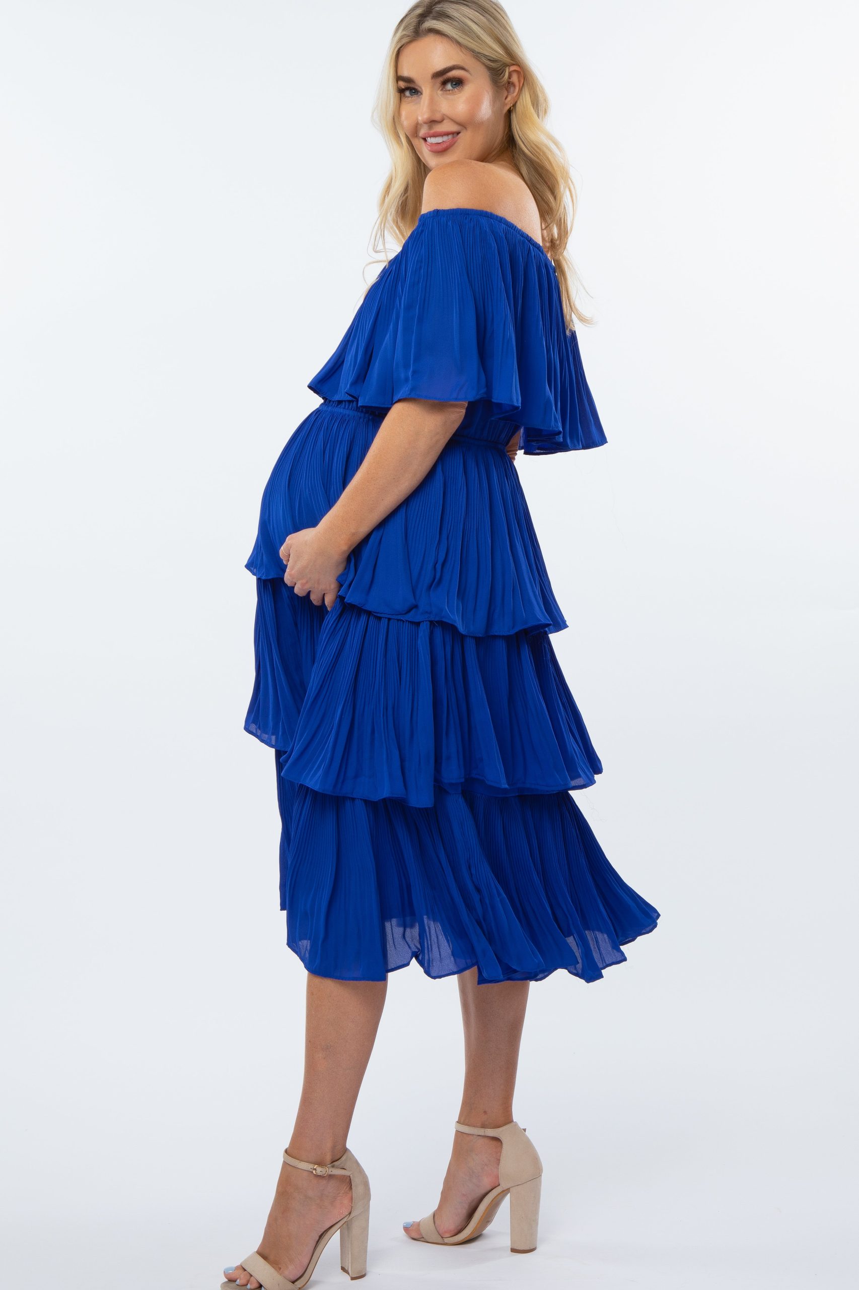 Details A solid maternity midi dress. Features pleated chiffon material, off shoulder elastic neckline. Dress is double lined. Content + Care
