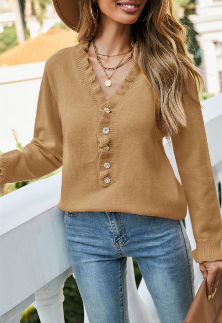 Ruffle Edge Button Front Knit Sweater in Tan
