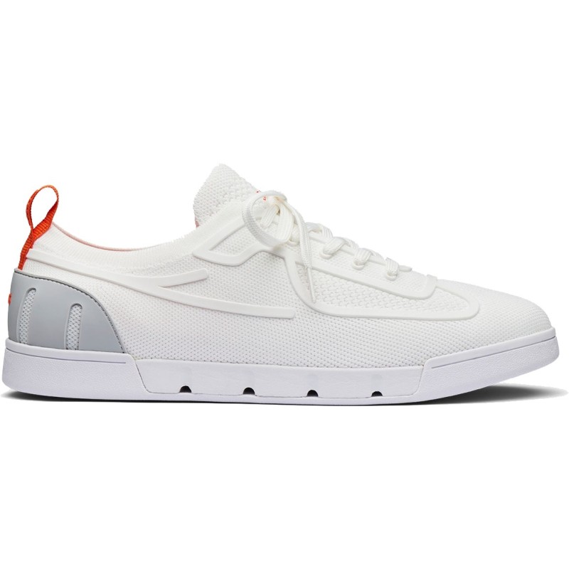 What’s unique to Swims sneakers is that they may be machine washed after having been beat up, thus maximizing utility while at the same time being an exceptional alternative to either a dress shoe or a conventional leather sneaker. We offer three different colour variations, and this specific model comes in a crisp and easily combined white colour with a nicely contrasting orange logotype, giving the shoe a modest yet harmonic color scheme.