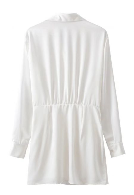 Get heads turning in this solid color shirt dress. Featuring the drape satin material is breezy and comfy, with ruched detailing and a wrapped design. Style it with some gold accessories and heeled mules for a look that is sure to get you noticed.